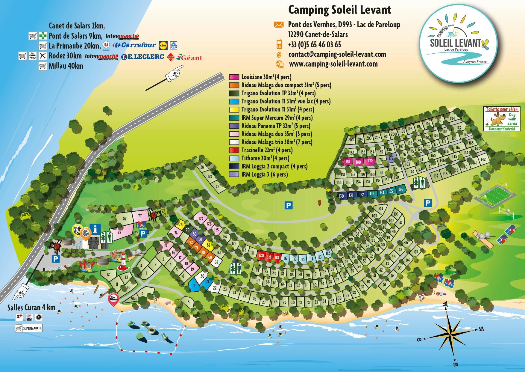 Situato sull'imponente bacino di Pareloup, il campeggio Soleil Levant accoglie i suoi ospiti. La posizione privilegiata offre agli ospiti una fantastica vista panoramica e relax sulle rive del lago Pareloup. Qui le vacanze con tutta la famiglia sono possibili. Varie attività, spiagge, giochi per bambini, compresa la possibilità di noleggiare barche e case mobili, ecc. Nel cuore dell'Aveyron, nella zona di Canet-de-Salars, vicino a Millau e Rodez, siti eccezionali come le grotte di Roquefort, la riserva naturale dei Grands Causses e le gole di Millau sono perfetti da esplorare. Gli amanti degli sport acquatici troveranno opzioni adrenaliniche come jet ski, sci d'acqua o motoscafo. Per chi vuole stare tranquillo in acqua, si consiglia un giro tranquillo in pedalò o in canoa. I bambini possono divertirsi nel parco giochi o mostrare le loro abilità di salto sul trampolino.